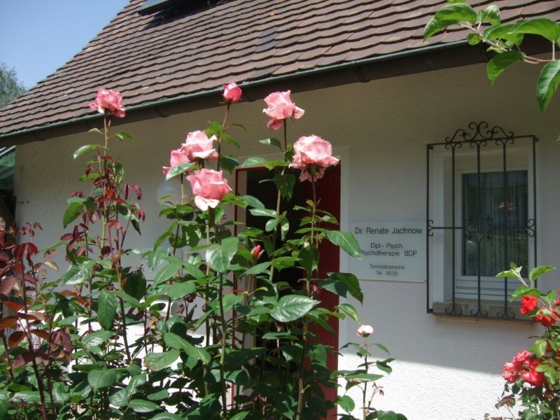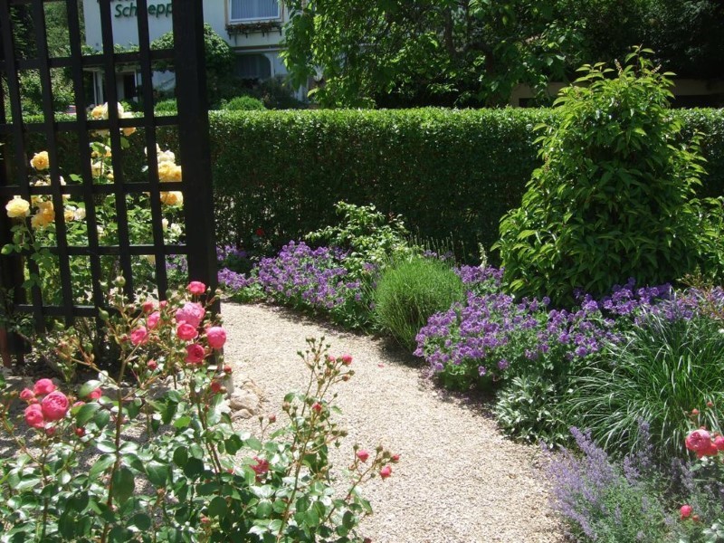 Schöne, pflegeleichte Außenanlage mit Bäumen, Sträuchern, Stauden und Blumen, hübscher Einfriedung und schöner Freisitzmöglichkeit